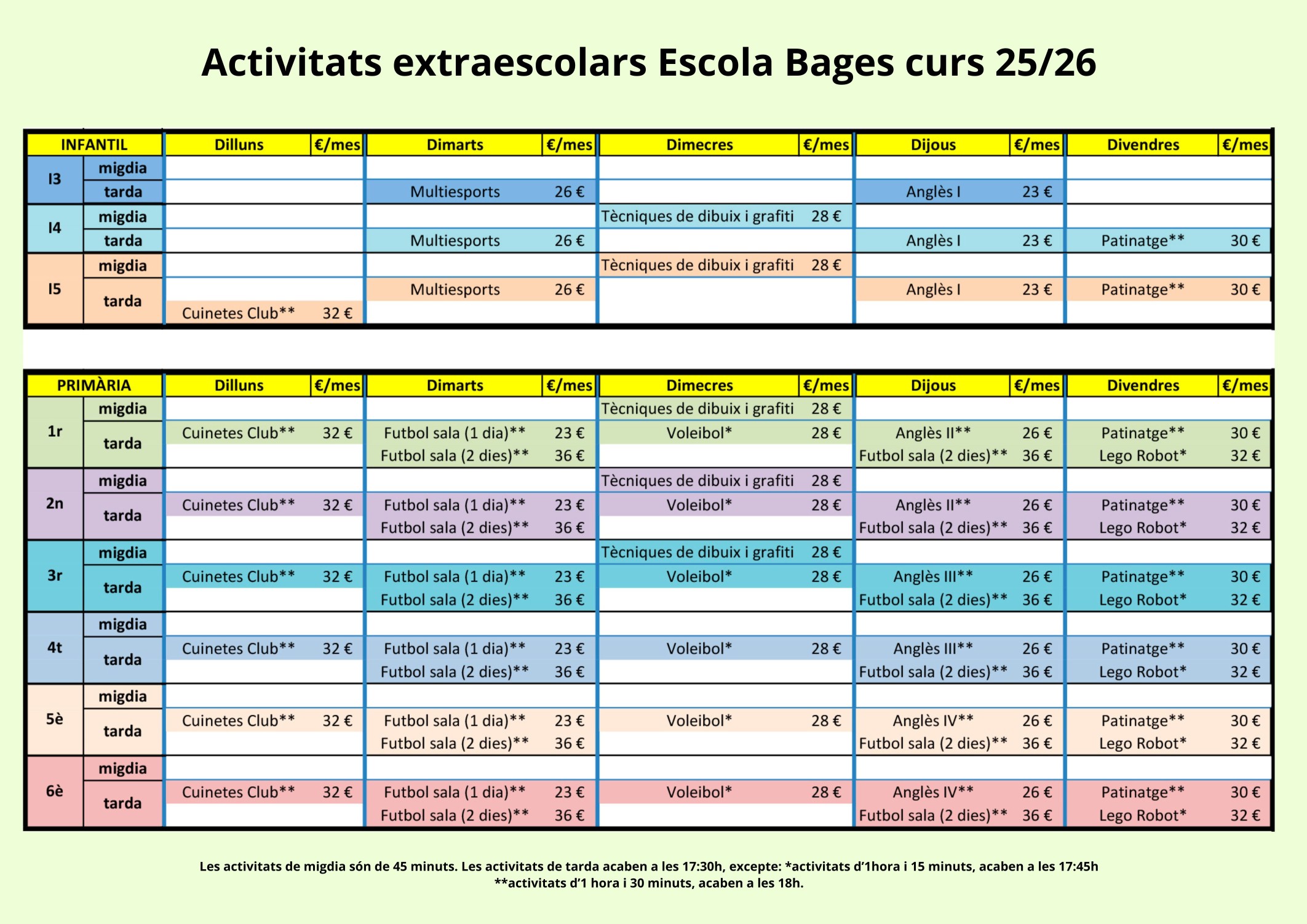 Extraescolars Escola Bages Informació de Contacte: Sílvia MartíT.696981466info@eltallerdelbosc.catC/Abat Oliba 22, baixos, 08242 ManresaPer poder realitzar les activitats extraescolars, cal que sigueu socis de l’AFA el curs 2025-2026 inscripcions inscripcions